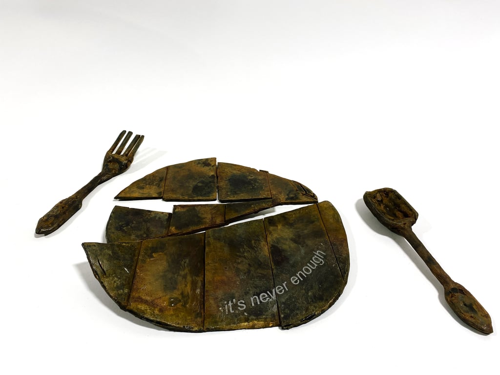 One piece I’m especially proud of is “it’s never enough”, which I made in 2023. It’s a broken plate with a fork and spoon all constructed from frankensteined scrap metal, with the phrase “it’s never enough” revealed on the surface of the plate.